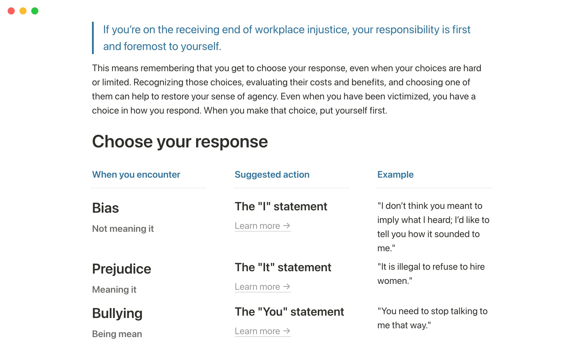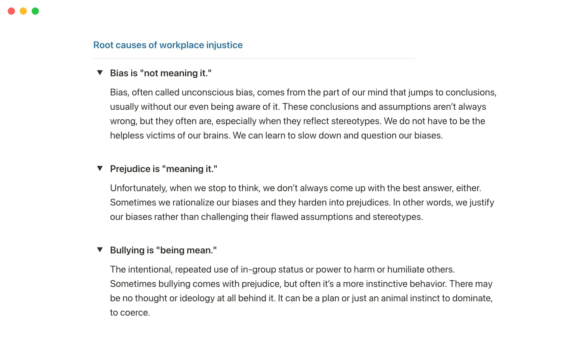 Injustices in the workplace are often labeled as just one thing: bias. But it's more complicated than that — the template includes Kim's breakdown of injustices into bias (not meaning it), prejudice (meaning it), and bullying (being mean) so you can more effectively respond to each situation.