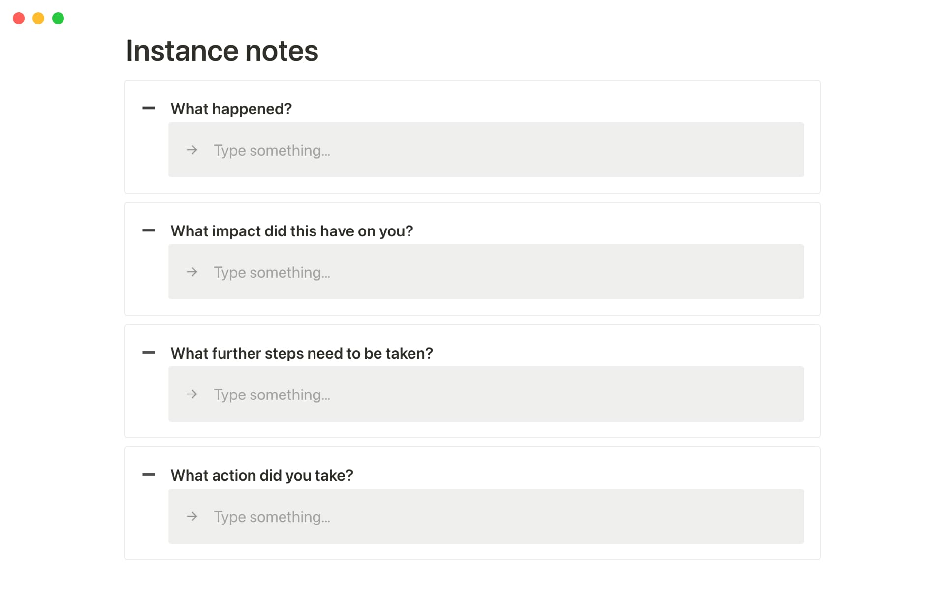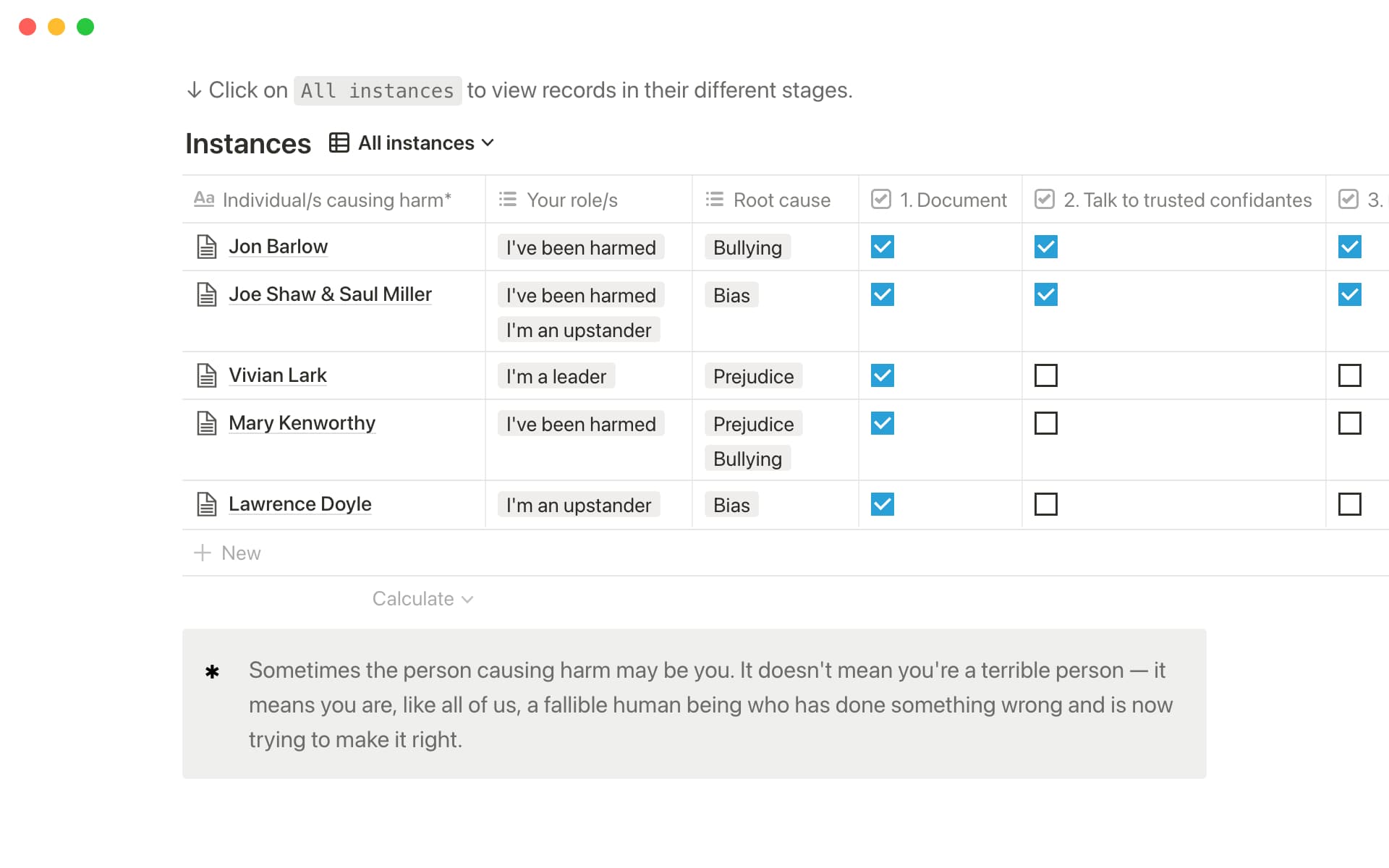Track the actions you’ve taken for each instance by using checkboxes in the database to keep a clear record of your progress. You can also see at a glance which instances you’ve shared publicly or reported to HR in separate filtered views.