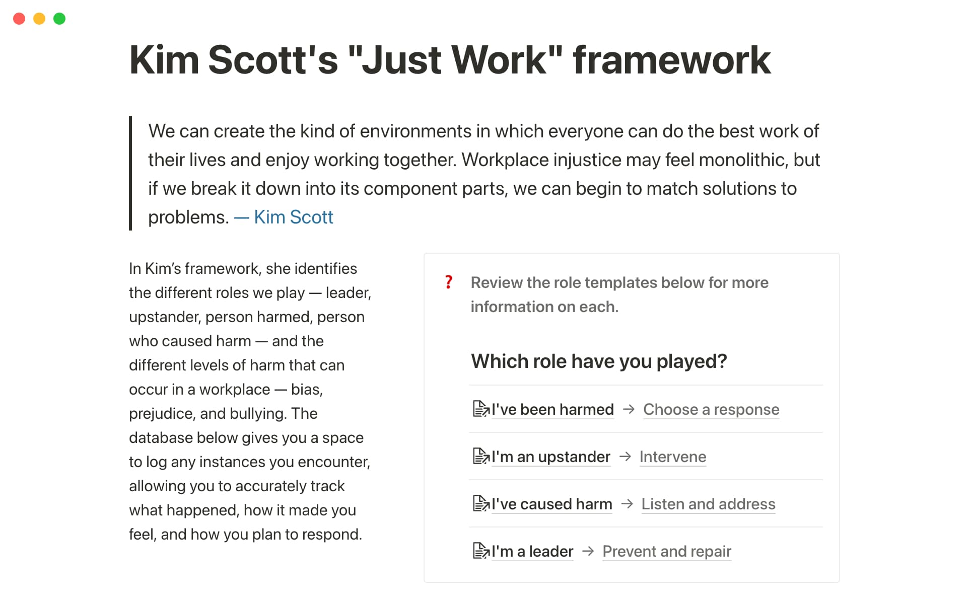 Bestselling author Kim Scott, who's helped hundreds of teams communicate better through Radical Candor, has partnered with veteran Chief People Officer Trier Bryant to tackle these injustices with their new Just Work framework. Put it into practice with her Notion template, which includes practical steps to log any injustices you encounter, identify your role, plan your response, and push your team toward a fair outcome.